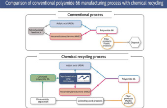 The manufacturing process for PA66 using HMD and ADA obtained by depolymerization with this technology is expected to reduce GHG emissions compared to the conventional PA66 manufacturing process, while further reduction of GHG emissions may be achieved by the use of renewable energy for the power required to generate the microwaves.
