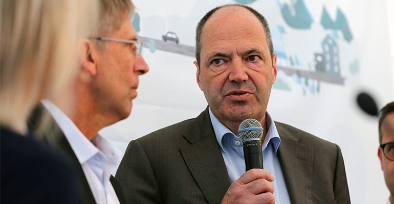 Shovel in the ground to mark construction start of the pilot phase of the HYBRIT project at SSAB in Luleå – a concerted effort with (LtR) Swedish PM Stefan Löfven (left); Niklas Nordström, Luleå Council Chair; Mårten Görnerup, CEO, HYBRIT; Jan Moström, President & CEO, LKAB; Magnus Hall, President & CEO, Vattenfall; Martin Lindqvist, President & CEO, SSAB; Rémy Kolessar, Swedish Energy Agency and Deputy Prime Minister and Minister for International Development Cooperation and Climate Isabella Lövin.