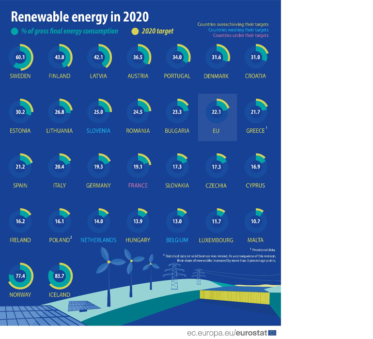 The Member States that significantly exceeded their 2020 targets were Sweden, Croatia (both +11 pp), and Bulgaria (+7 pp). With more than half of gross final energy consumption from renewable sources, Sweden (60%) had by far the highest share among the EU Member States in 2020, ahead of Finland (44%), and Latvia (42%) respectively.