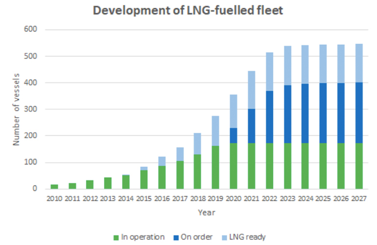 According to the report, LNG accounts for just over 3 percent of total marine fuel consumption. There are currently 173 LNG-fuelled vessels19 in operation with approximately 230 on order and a further 150 LNG-ready ships (vessels which have been designed for retrofit to LNG) either in operation or on order. Since the beginning of the decade, the number of LNG-fuelled vessels has grown consistently by between 20%-40% per annum, expanding from the short sea shipping sector in northwest Europe, where LNG as a marine fuel was pioneered, to international deep-sea shipping (graphic courtesy EBA).