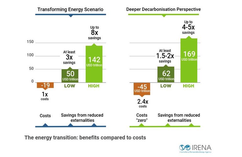 Low-carbon investment would significantly pay off, the Global Renewables Outlook shows, with savings eight times more than costs when accounting for reduced health and environmental externalities (graphic courtesy IRENA).