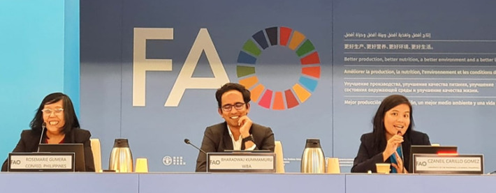 Czaneil Gomez (right) presented her study to the 11th GBEP Bioenergy Week participants. On the panel are Rosemarie Gumera, CONFED, the Philippines, and Bharadwaj Kummamuru, World Bioenergy Association (photo courtesy SEARCA).