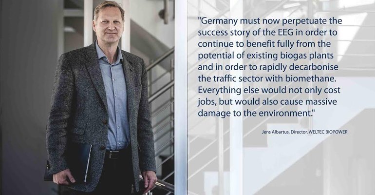 In Germany, renewable energies are the Number One power source, and the whole world has come to view the EEG as an effective instrument for the systematic, publicly approved expansion. Moreover, the law and its adaptations to new market conditions have constantly brought about new technologies that have become an indispensable element of many profitable energy plants, emphasized Jens Albartus, Director of the German biogas plant manufacturer Weltec Biopower GmbH.