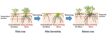However, in ratoon cropping, the depth at which new shoots emerge from the underground stubble after harvest tends to become shallower, leading to lower yields and a reduction in regrowth cycles.